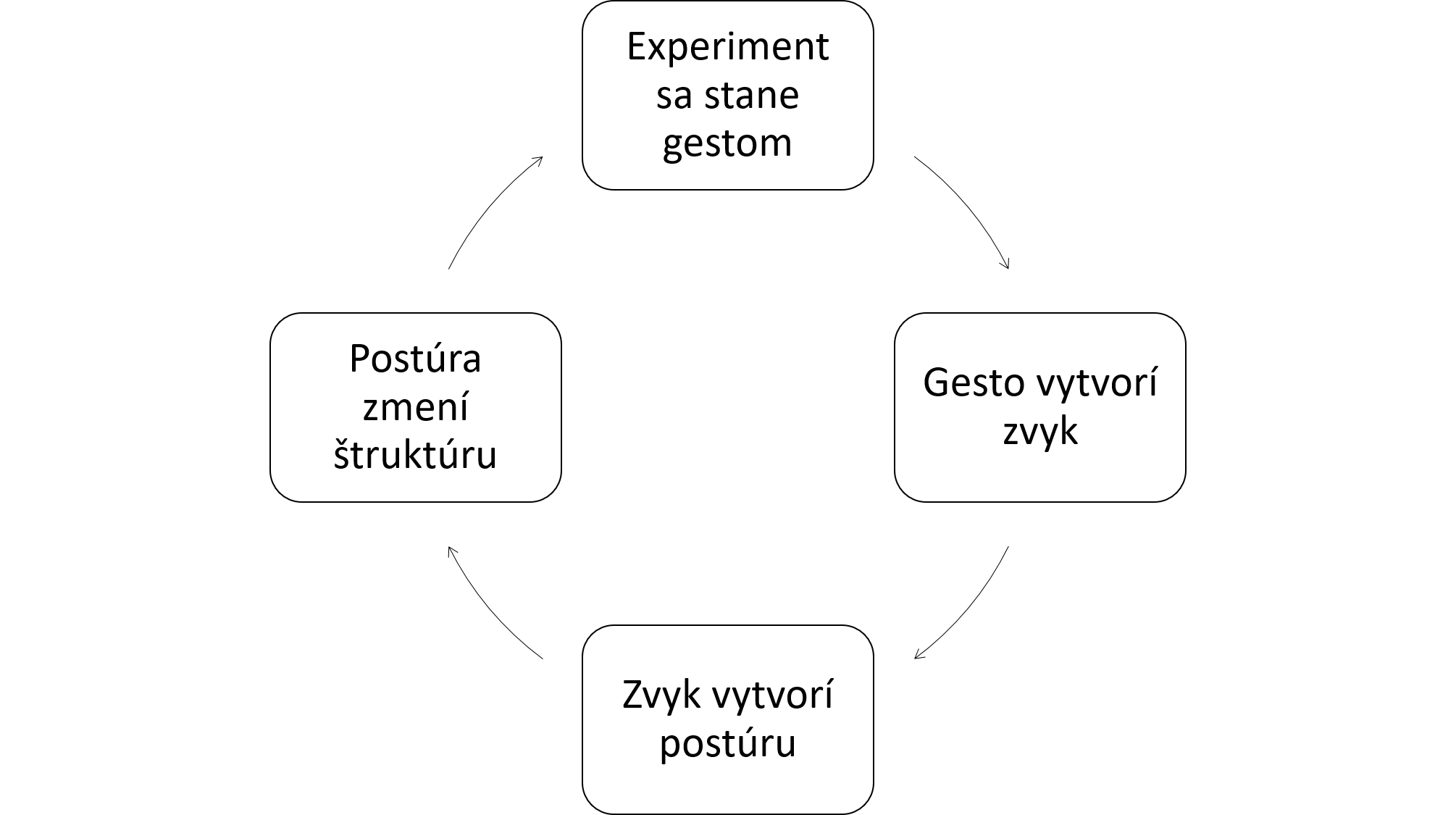 Každý pohyb začína experimentom, myšlienkou, čo je prejavom neuromotoriky a jeho učenia. Dostatok opakovaní daného pohybu nám doslova vyšliape cestu v mozgu, zakorení ho, aby gesto bolo oveľa ľahšie zopakovať. To všetci vieme. Následne sa sekvencia zapojenia svalov zafixuje do podvedomia ako zvyk, ktorý je ľahko vyvolateľný, ale naopak ťažko podlieha k zmene. Akonáhle sme si pevne vybudovali zvyk, je ho treba zachovať, čo vyžaduje zmenu postúry. Táto preferencia sa doslova vytesá do našej postúry. Vydržte v tejto postúre dostatočne dlho a oblasti, ktoré podliehajú preťaženiu si budú užívať vyššiu aktivitu fibroblastov, čo následne produkuje viac kolagénovej siete v rámci svalov alebo medzi nimi. Ba dokonca z fibroblastov sa stanú myofibroblasty, ktoré ovplyvňujú fasciálnu tuhosť, čo sa stáva najčastejšie pri hojení rán. Najskôr sa zmení iba viskoelasticita fascie, čo zmení jej vlastnosti a po čase sa zmení i kolagénová štruktúra. V tomto bode sa dostávame z čisto neurologického vzoru k fasciálnej reštrikcií. Od tohto bodu, akýkoľvek nový experiment a gesto sa pacient bude učiť, bude podliehať limitácií štruktúry, spolu s limitáciou neuromotorického zapojenia. T.j., rozličné zapojenie svalových vretienok či golgiho aparátu.
